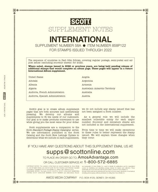 Scott International Album Pages: Part 55A for stamps released through 2019 (United States + Countries A-K).This Scott Album Supplement covers regul...