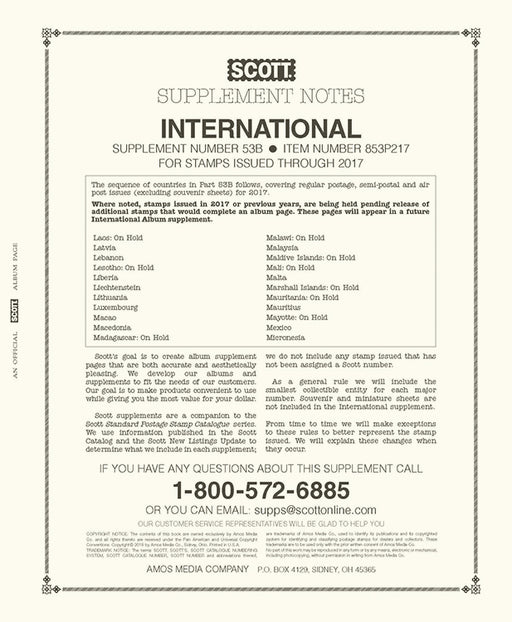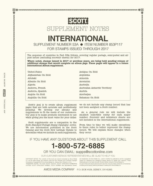 Scott International Album Pages: Part 53A for stamps released through 2017 (United States + Countries A-K).This is a brand new Scott Album Suppleme...