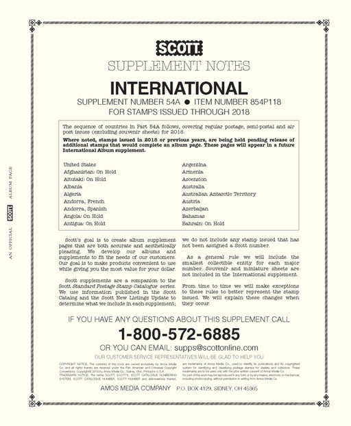 Scott International Album Pages: Part 54A for stamps released through 2018 (United States + Countries A-K).This Scott Album Supplement covers regul...