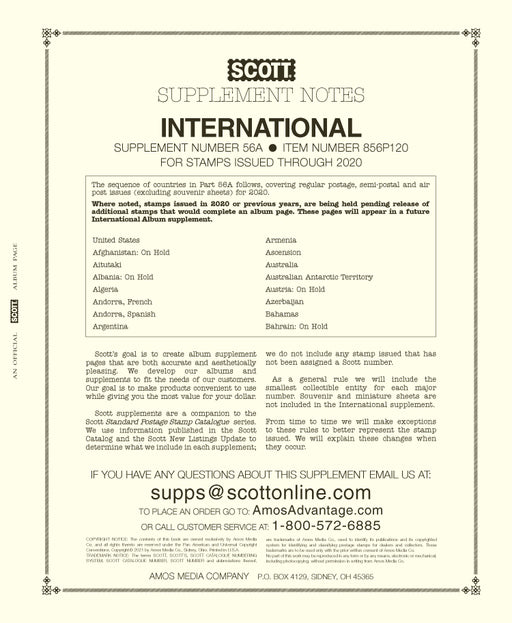 Scott International Album Pages: Part 56A for stamps released through 2020 (United States + Countries A-K).This Scott Album Supplement covers regul...